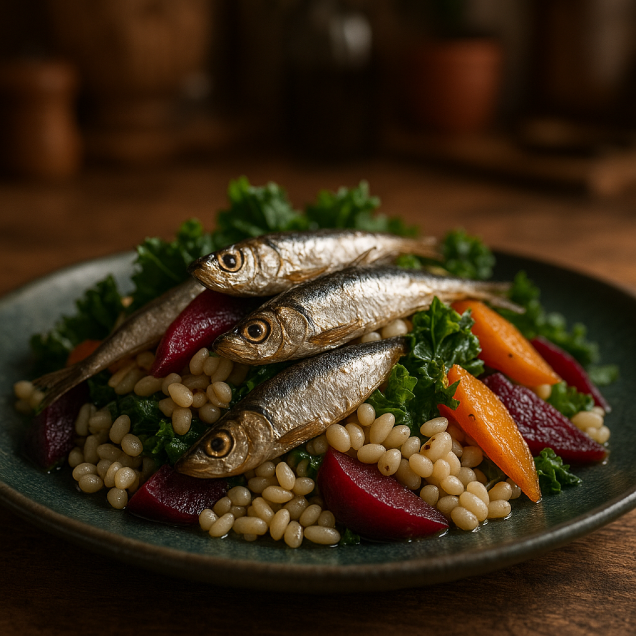 В кастрюле соединить перловку, обжаренные овощи и филе кильки. Приправить солью и перцем.